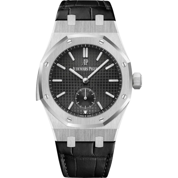 This luxurious timepiece is crafted from 950 platinum, encased with glareproofed sapphire crystal and a screw-locked crown. It features a black dial with "Grande Tapisserie" pattern, white gold applied hour-markers, and Royal Oak hands coated in luminescent material for legibility.