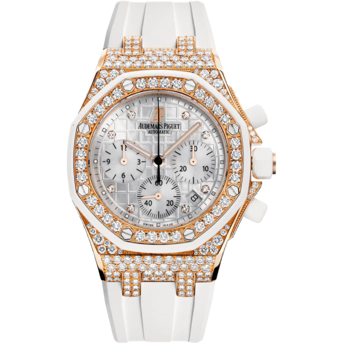 Royal Oak Offshore Chronograph 37MM White Rubber Strap Silvered Dial With Méga Tapisserie Pattern 18-Carat Pink Gold Case Entirely Set With Diamonds
