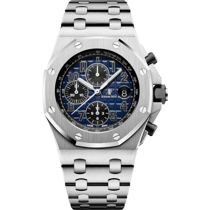 Royal Oak Offshore Chronograph 42MM 950 Platinum Bracelet Smoked Blue Dial With Méga Tapisserie Pattern 950 Platinum Case SELFWINDING CHRONOGRAPH