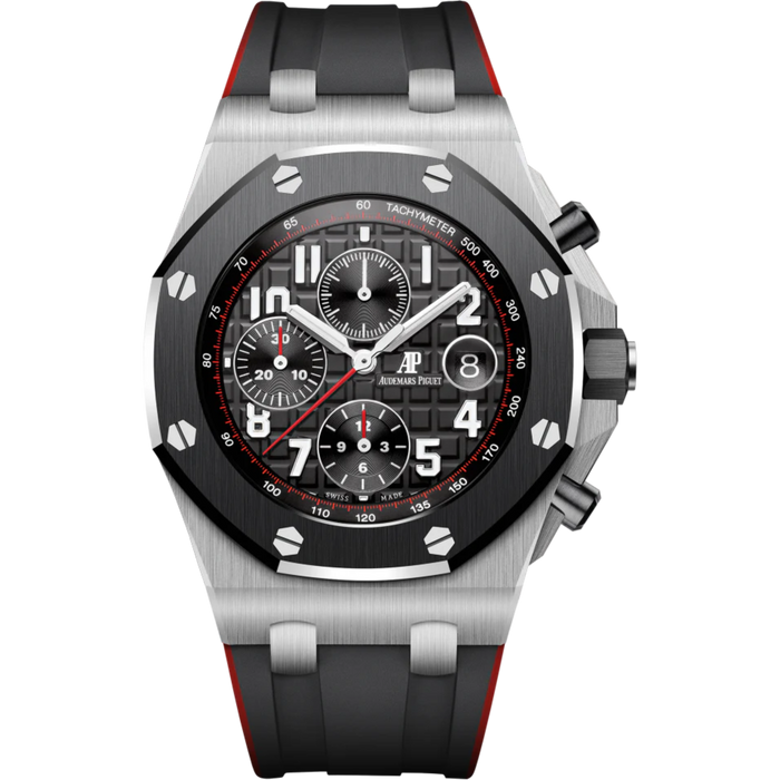 Introducing a timepiece that is perfect for your next adventure - the Royal Oak Offshore. Black with a hint of red to draw attention to its chronograph features, this watch combines stainless steel, ceramic and rubber to create an unforgettable design. So strap on your Royal Oak Offshore and get ready to explore!