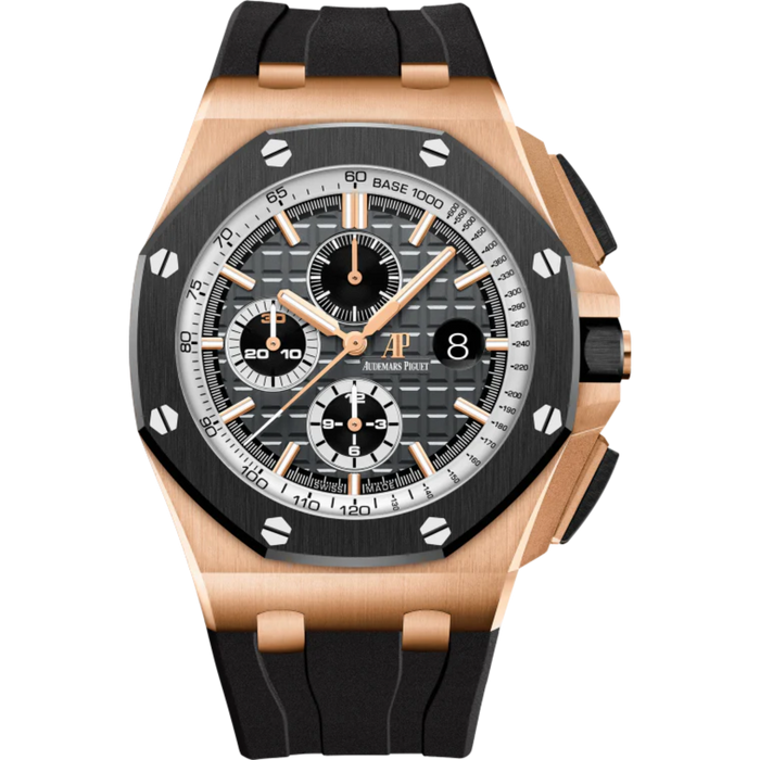Royal Oak Offshore Chronograph 44MM Black Rubber Strap Black and White Dial With Méga Tapisserie Pattern 18-Carat Pink Gold Case Black Ceramic Bezel SELFWINDING CHRONOGRAPH