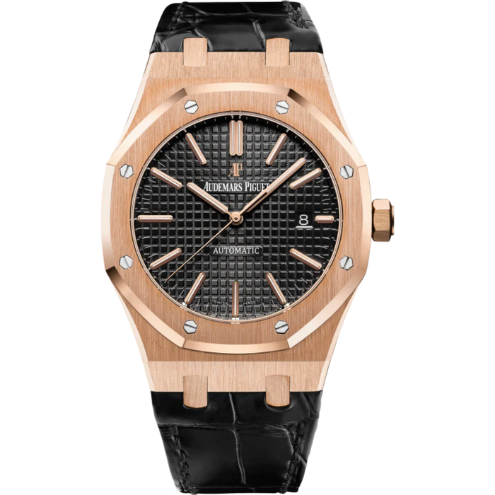 Royal Oak Selfwinding 41MM Black Alligator Strap Black Dial With Grande Tapisserie Pattern 18-Carat Pink Gold Case SELFWINDING