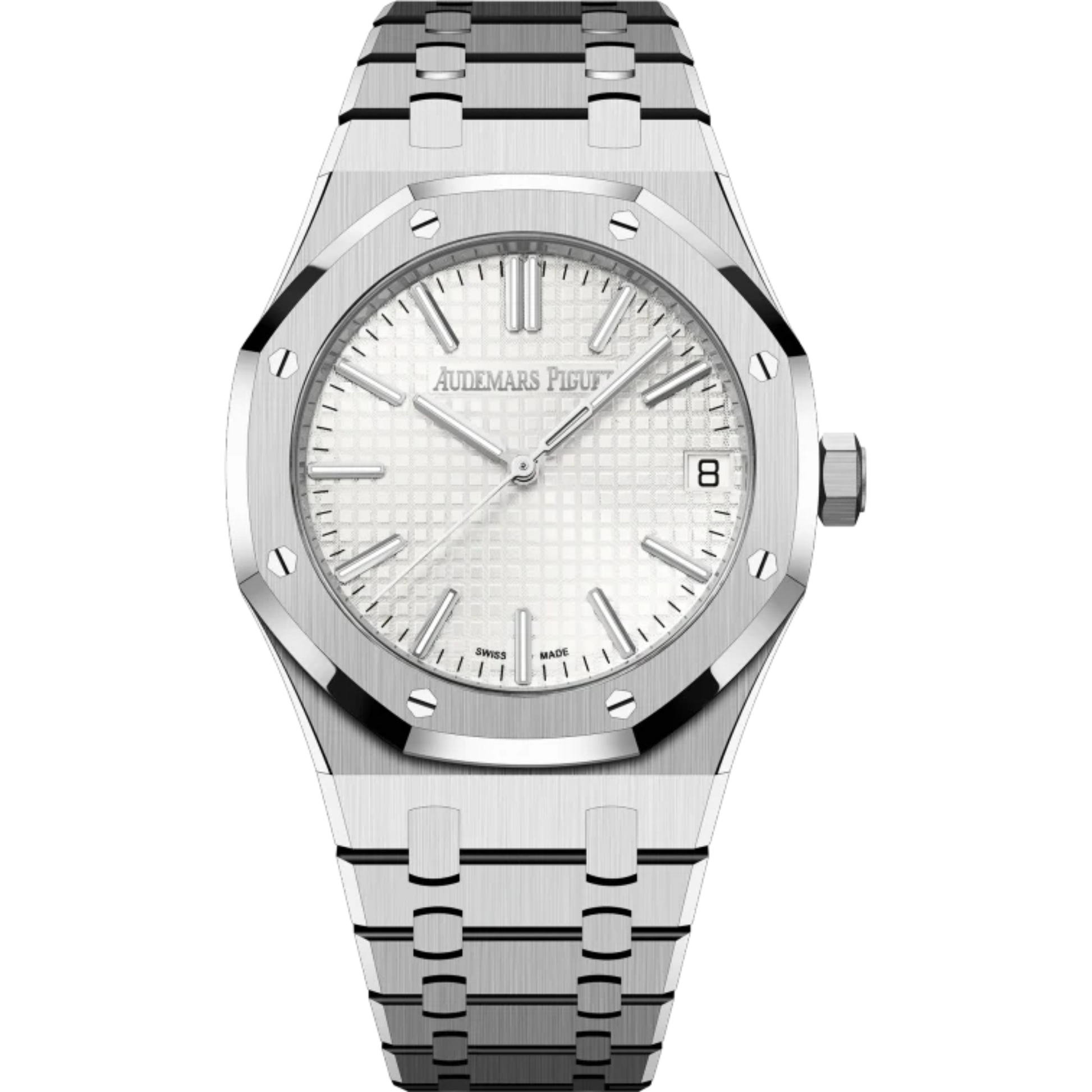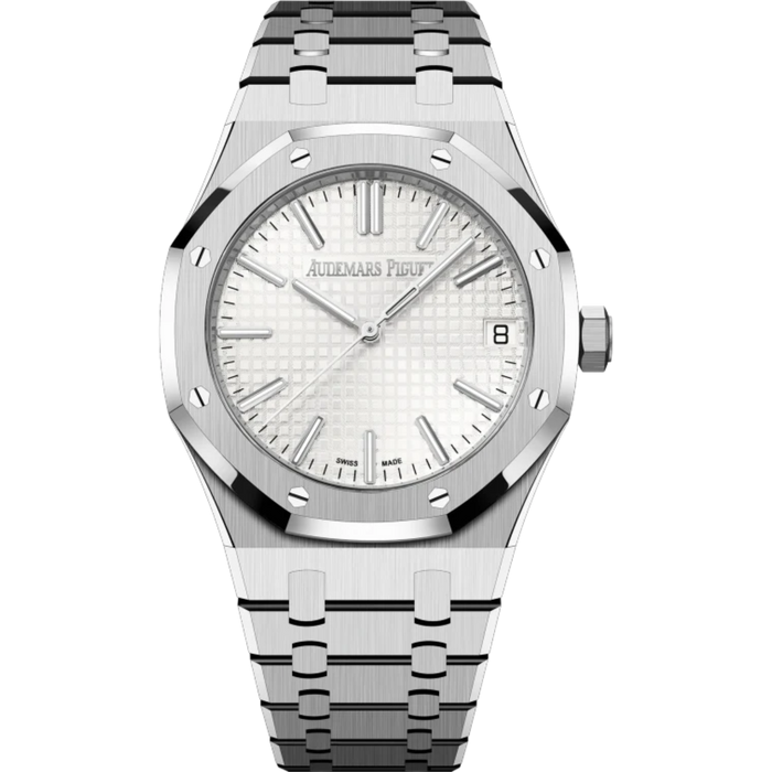 This 41 mm stainless steel Royal Oak Selfwinding features a striking silver-toned "Grande Tapisserie" dial, representing the collection's most recent design developments in terms of ergonomics.